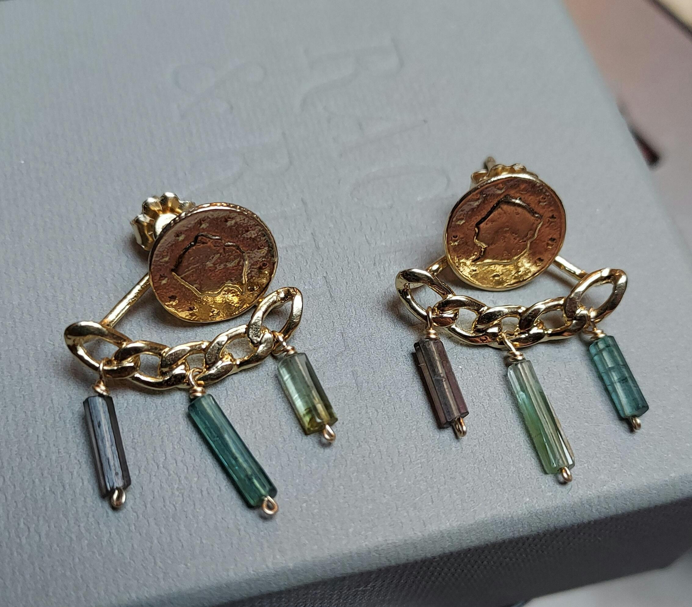 I ordered the tourmaline thera earrings. Although the gold plated parts look great, none of the tourmaline stones are the same color and some look much lighter than the dark green pictures on the website and one looks rough/grainy. Can be great if you find the different colors even more appealing but not what I thought I was buying. Great design but overall a slightly disappointing product.